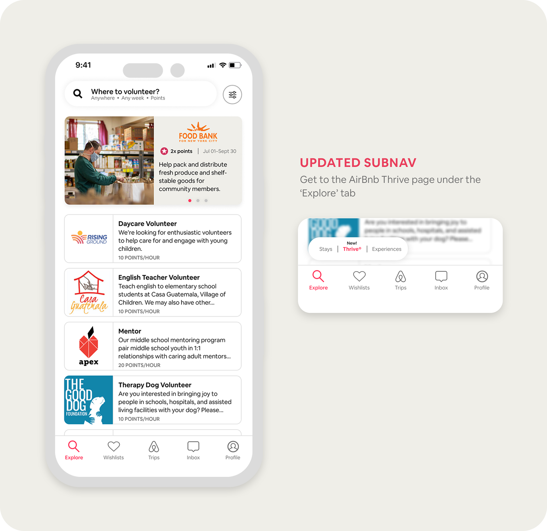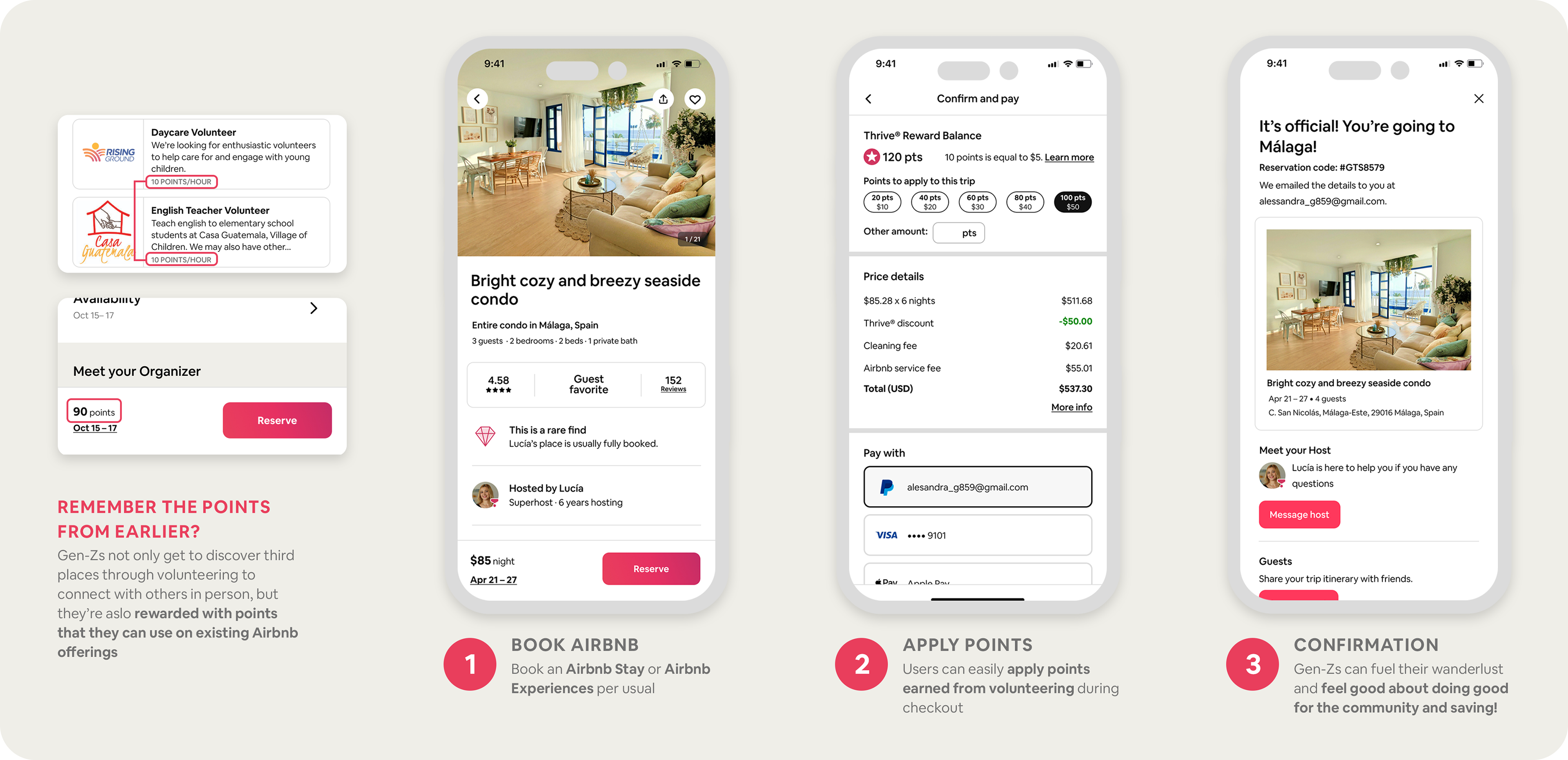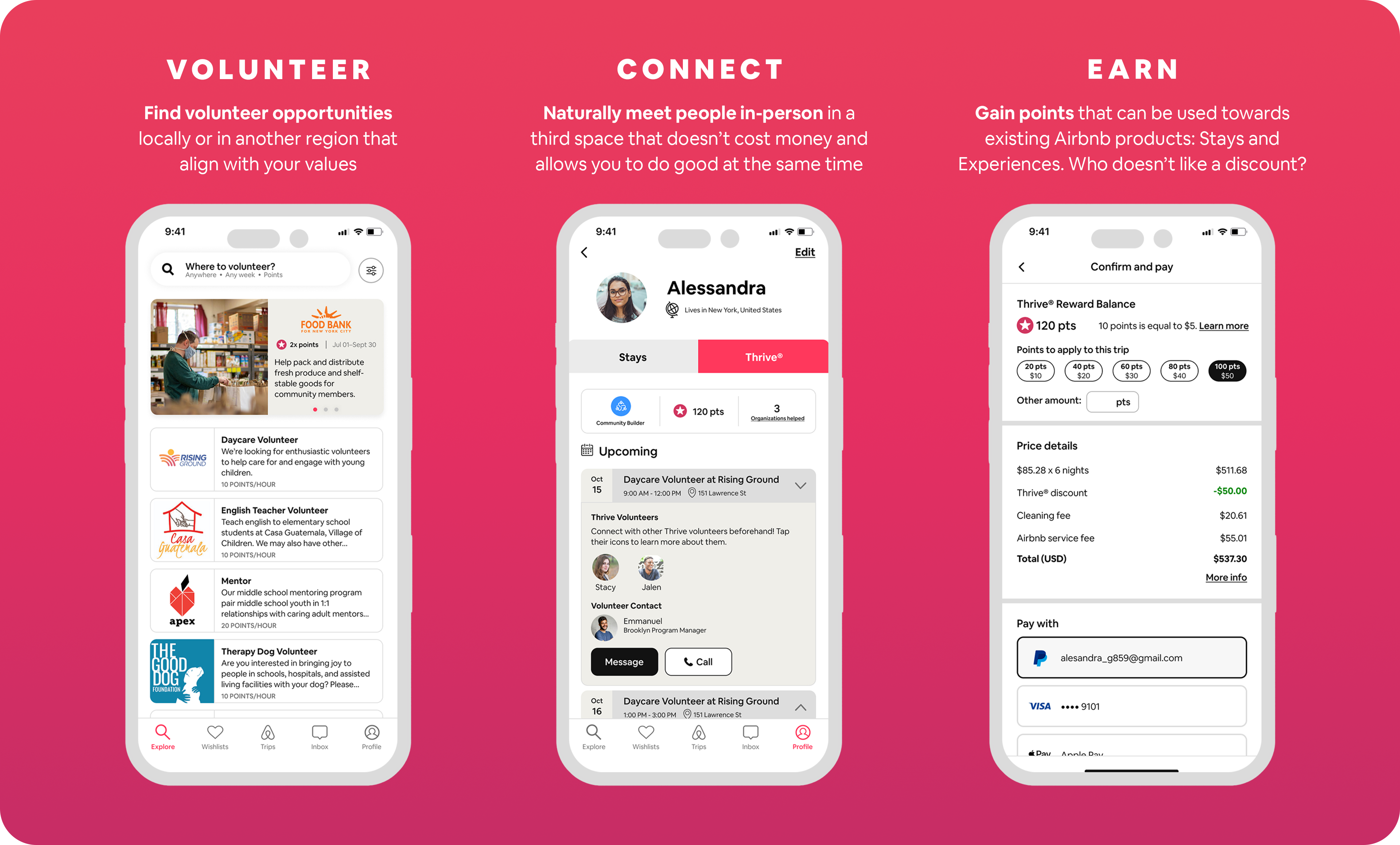 Create a volunteering integration, Airbnb Thrive, that will not only provide Gen Z-ers a free third space to make in-person connections, but also do social good while earning points that they can use to do other things they value such as travel and gain new experiences.