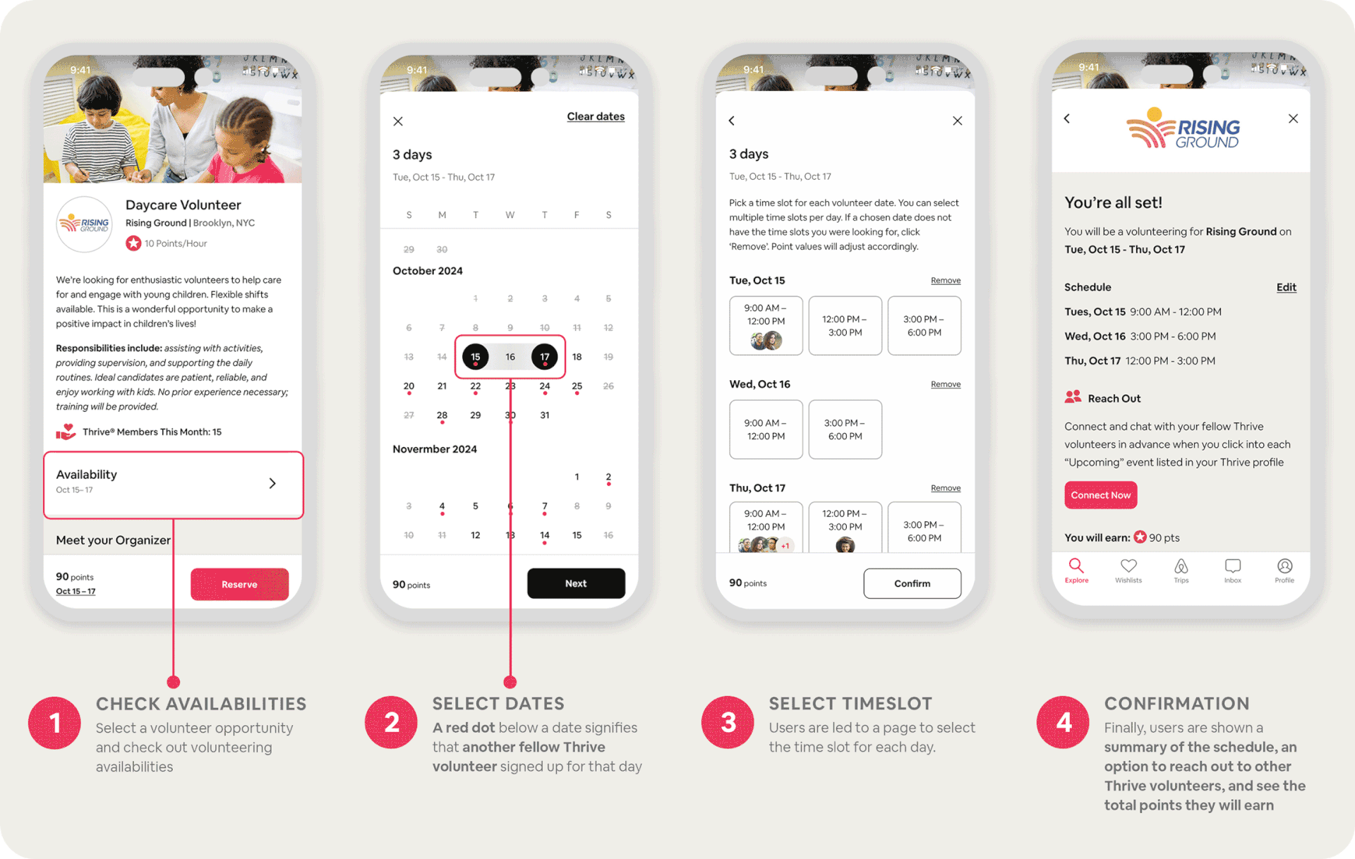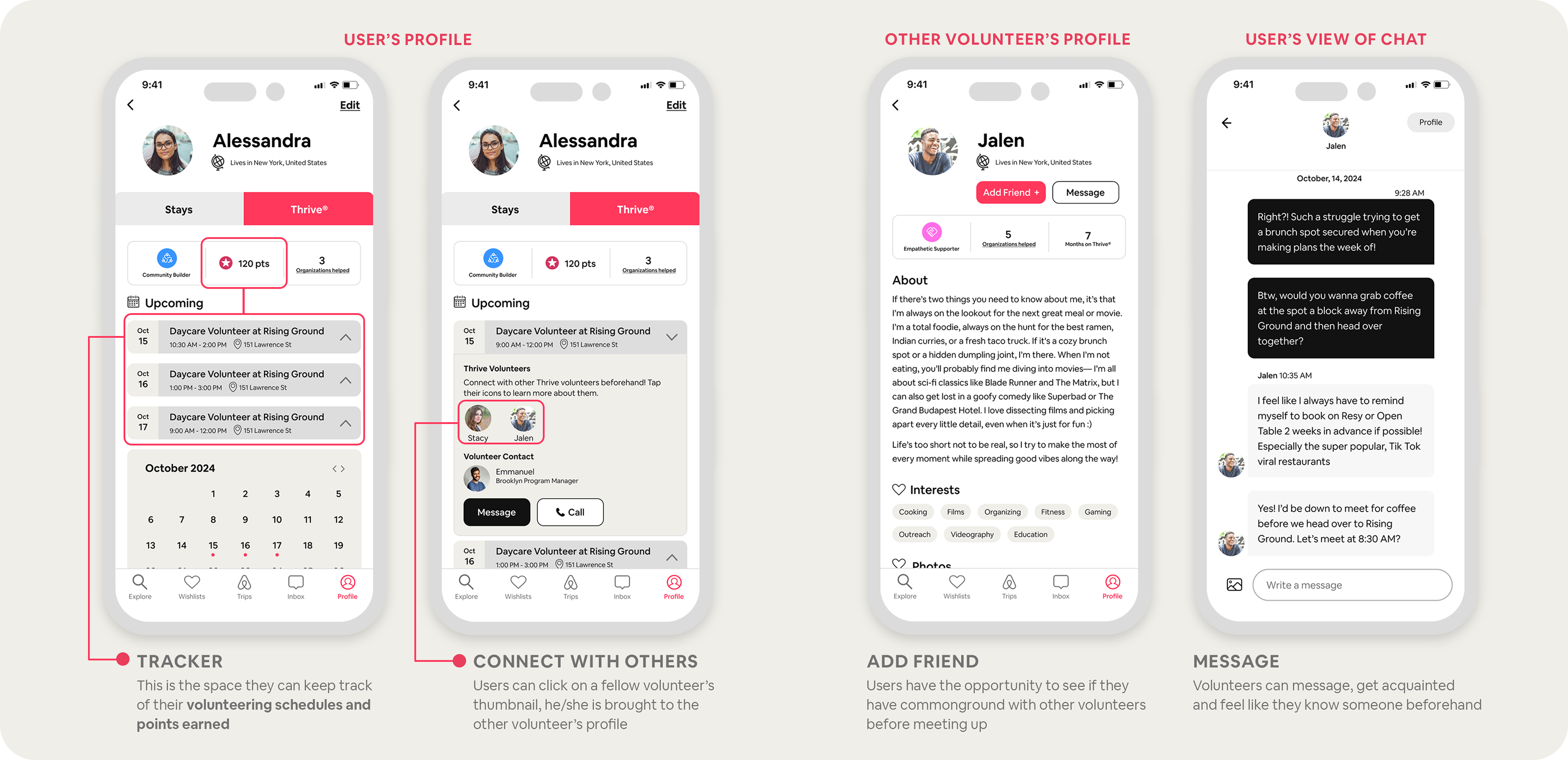 It can be a bit awkward to go into a new environment without knowing anyone. Thrive solves this by allowing users to connect with other volunteers listed in the calendar event detail. Once the user clicks on a fellow volunteer’s thumbnail, he/she is brought to the other volunteer’s profile. In their profile, a user can share a small bio about themselves, list some of their interests, and display photos to introduce themselves to other users