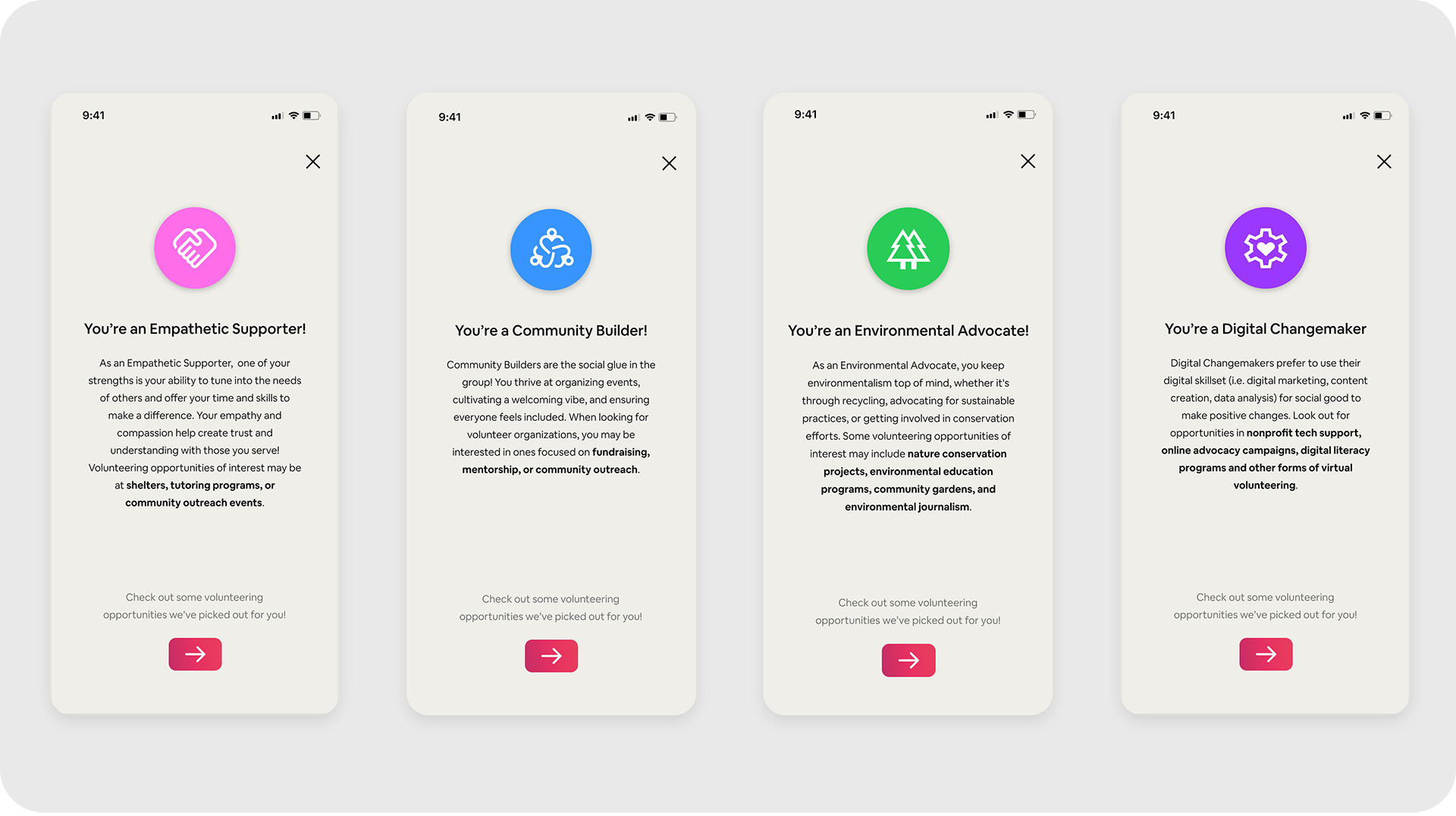 The quiz will ask a few simple questions that will help users figure out what volunteering opportunities best align with the goals and impact they want to make. At the end of the quiz, users will see what volunteer archetype they, which will also shape their volunteer opportunity algorithm